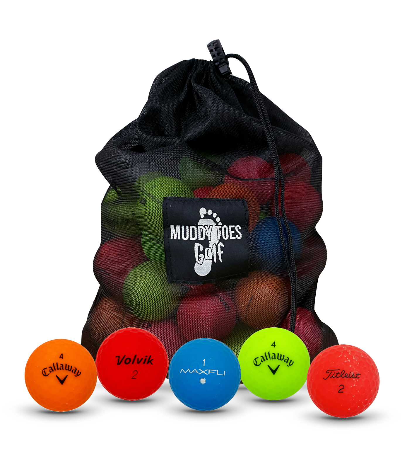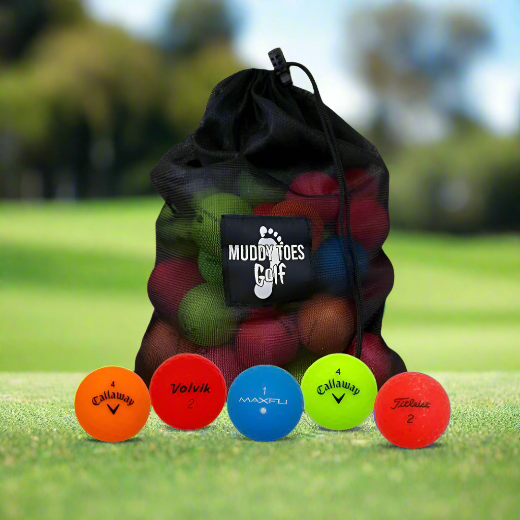 The Muddy Toes Matte Color Mix comprises of any and all brands of golf ball that is colored and has a matte finish. It is a great mix for anyone especially those who cant ever find their ball! With distinct colors ranging from bright pink to blue and even red theres a color for everyone.